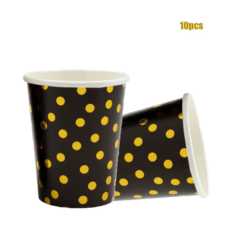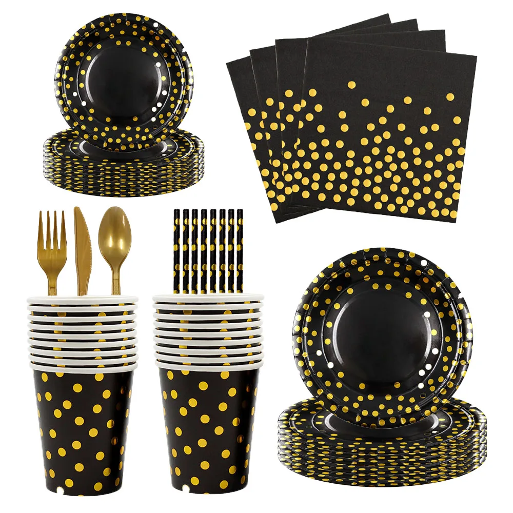 Elevate your event with the timeless charm of this Black & Gold Party Decoration Tableware Set—a complete disposable set that combines fashionable design with effortless convenience. Perfect for birthdays, weddings, anniversaries, and holidays, this set features elegant golden dot accents on a sleek black backdrop for a bold yet classy party vibe.