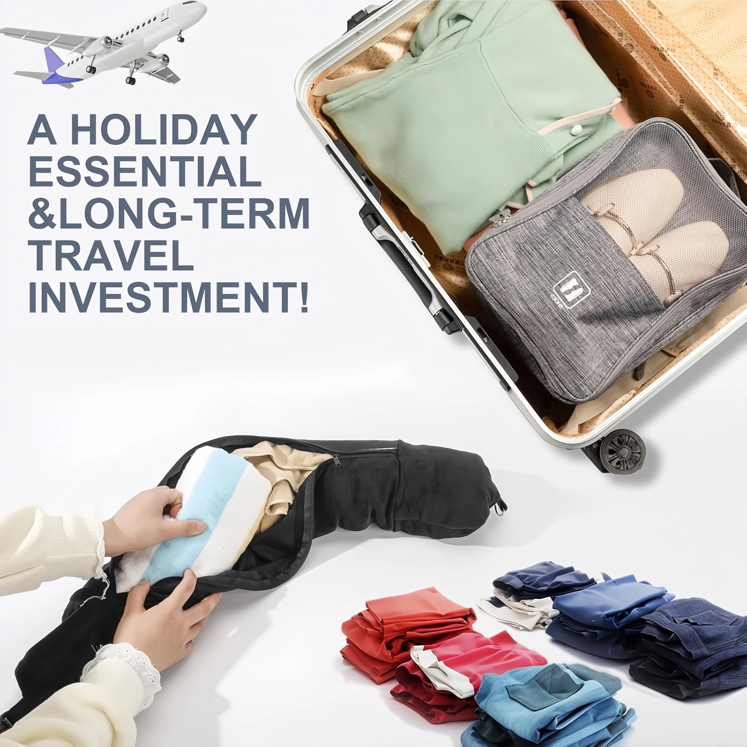The ultimate 2-in-1 space-saver for modern travelers. Just fill, zip, and snooze!