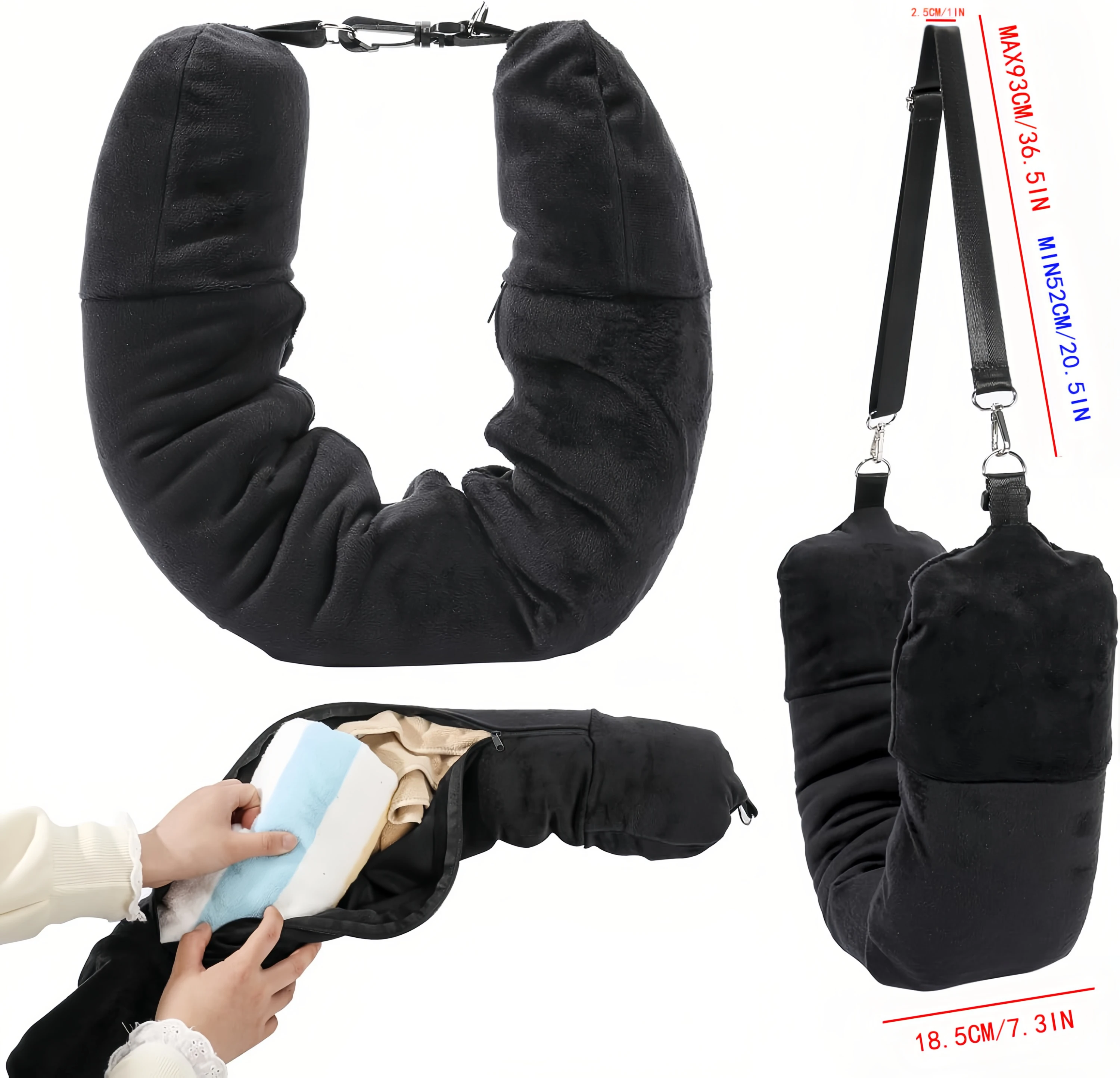 Functions as a travel neck pillow, shoulder strap bag, and storage pouch all in one.